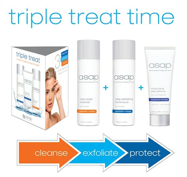 Cleanse exfoliate and protect skin with the asap triple treat pack. Daily facial cleanser 200ml. The ASAP Triple Treat is back for a limited time only. Asap Clear Complexion Gel. Suitable for all skin types and ages there arent many pe. Treat yourself and your complexion with this limited edition pack that includes the favourites you know and love from asap including the newest addition to the asap lineup their latest SPF. 1 x asap daily facial cleanser 200mL 1 x asap daily exfoliating facial scrub 200mL 1 x moisturising daily defence SPF50 100mL 1 x asap deluxe facial cloth Savings of 36 For a limited time only.